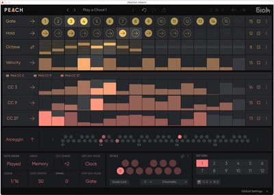 510k Arts PEACH, MIDI Plugin (Download), 4-voice sequencer, 4 independent voices with gate, pitch, length, hold and velocity tracks, Polymetric sequencing with varying step length per lane, Playback modes: Forward, Backward, Pendulum, Bi-directional and Random, Real time MIDI transpose, Scale quantisation, MIDI advance mode, Step-lock functions, Global and lane-specific randomisation, Up to 12 patterns per preset, MIDI export function