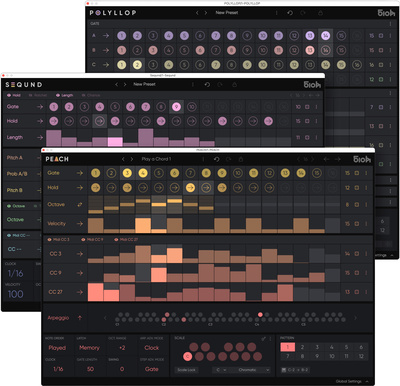 510k Arts PEACH+SEQUND+POLYLLOP, MIDI Plugin Bundle (Download), Bundle consisting of three MIDI plugins, Includes the SEQUND sequencer, the PEACH arpeggiator and the 4-voice POLYLLOP sequencer