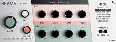 Klevgrand Reamp is een efficiënte plug-in voor spectrale saturatie die analoge reamping simuleert. Met zeven unieke algoritmes, waaronder cassette, tape en buizenversterkers, biedt het 4-bands drive en post-saturatie EQ. Perfect voor mixen en masteren met lage latency en oversampling