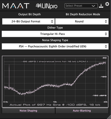 MAAT LINpro is een stereo dithering plugin die nauwkeurige dithering biedt met 8-, 16- of 24-bit output. Deze plugin beschikt over optionele rounding of truncation, evenals drie dither types: TPDF, HP-TPDF en RPDF. Daarnaast zijn er acht noise shaping algoritmen beschikbaar, variërend van 1e tot 9e orde, inclusief psychoakoestische curves zoals E-, F-, ITU- en UEN-gebaseerde. De geïntegreerde visualisatie van noise shaping curves helpt bij het optimaliseren van de output.