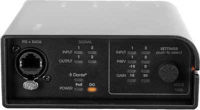 Flexibele 2 × 2 I/O Dante interface met analoge microfoon- en lijnsignalen