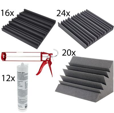 Pakketaanbieding bestaande uit 2x t.akustik WDS-7 GR Diffuser 8pcs Set, 3x t.akustik WAS-7 Absorber 8pcs Set, en 10x t.akustik CBT-37 Corner Bass Traps