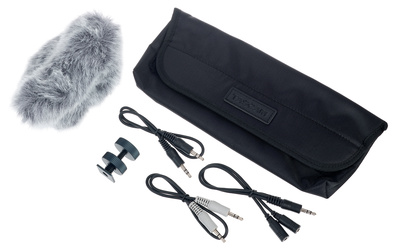 De set bestaat uit een stereo mini-jack kabel, een kabel met niveau-demping voor optimale geluidskwaliteit, een handige splitkabel voor het gelijktijdig aansluiten van zowel de camera als een koptelefoon, een flitsschoenadapter voor eenvoudige bevestiging, een kunstbond windkap voor het reduceren van windruis en een handige transporttas voor veilig vervoer.